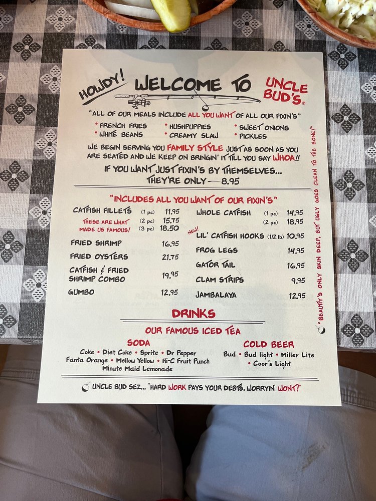 Introducing Uncle Bud's Catfish Chicken & Such, where Southern comfort food comes alive! Located at 2719 Old Lebanon Pike, Nashville, TN, this casual eatery is famous for its mouth-watering catfish and chicken dishes. The menu features hearty offerings like the Chicken Tender Dinner paired perfectly with world-famous hush puppies, white beans, and slaw. With all-you-can-eat options on Sundays, it’s a feast for the senses.